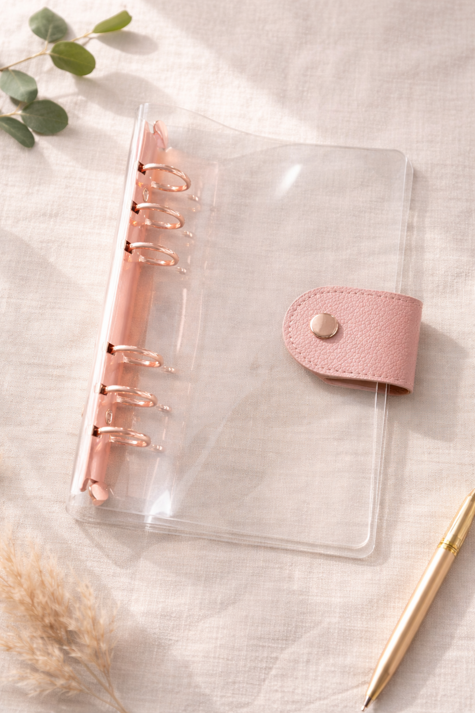 Przezroczysty segregator A6 z różowymi okuciami to baza do stworzenia Twojego własnego systemu budżetowania kopertowego.